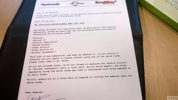 在条款中以下游戏被禁止讨论: Fallout Fallout 4 Fallout: Nuka World Boston Project Elder Scrolls Elder Scrolls VI Greenheart Project 这份条款收录了所有保密的游戏名单,直到海因斯先生允许,否则将不会透露出半点细节。 如果你还记得去年《辐射4》的泄露影像,那么你应该知道本作设定地点在波士顿。 我们通过道具列表发现Greenheart Project很可能是《上古卷轴》类新作。 禁止谈论这些游戏说明公司不希望未公布的作品过早暴露于世人面前。 尽管《辐射4》在剧情有许多漏洞,但是贝塞斯达并未处理这些问题。 虽然这份条款可能只是个噱头,但我们确实非常期待《辐射4》和《上古卷轴》新作出现在今年E3展上。