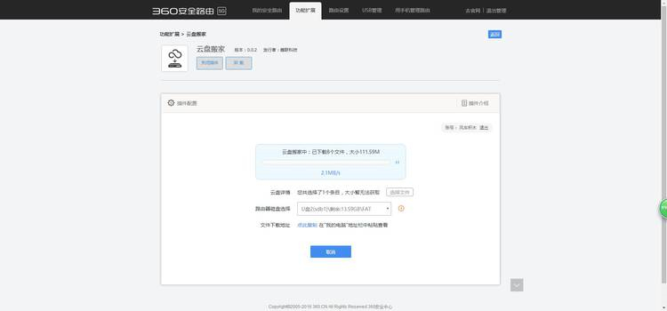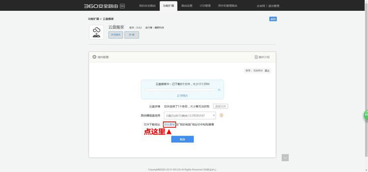 那么,如果您只想要下载多级目录下的文件/文件夹的话,可以进入360云盘客户端,将您要下载的文件/文件夹移动到云盘的根目录(虽然目前云盘已经关闭了上传文件功能,但就目前而言,移动文件/文件夹还是可以的),再用路由的云盘搬家插件下载,就可以了