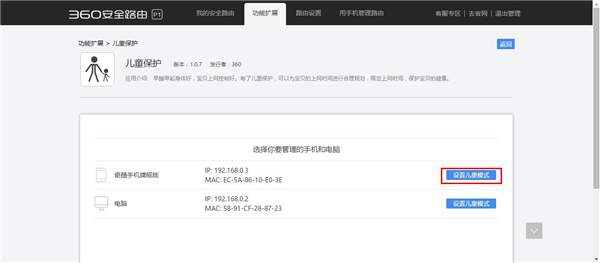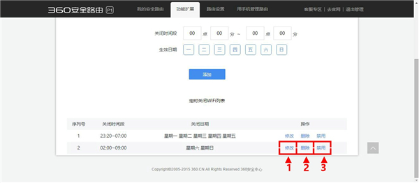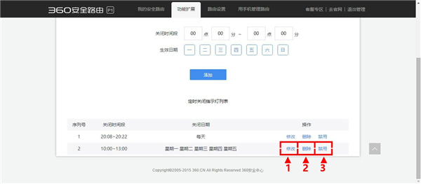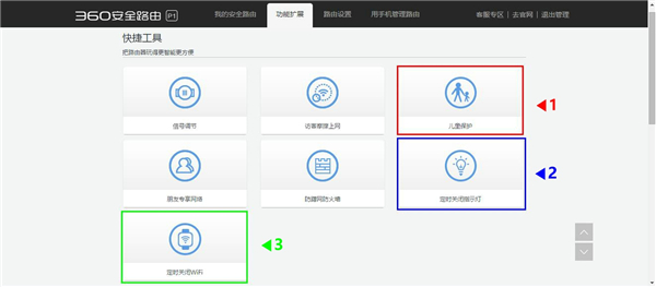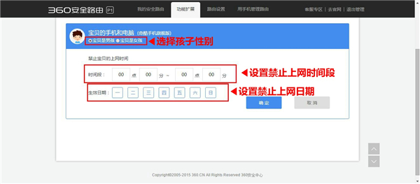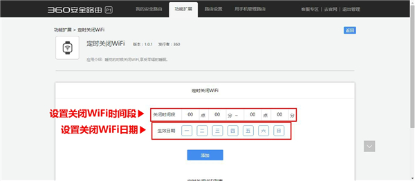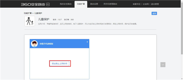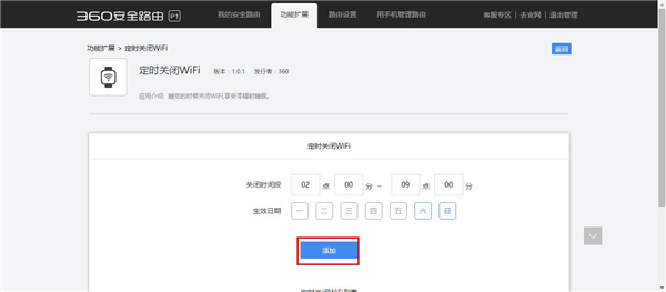 360安全路由(C301)是360自主研发的一款具备多重防护功能的智能安全路由器。360安全路由拥有全方位防黑,高速双频1200M、智联智控、精工打造、高性价比等特点。从捍卫网民利益出发,首创360sOS安全系统彻底解决路由器安全问题,真正做到“WiFi—防入侵蹭网无门,路由—防篡改防劫持”,为广大用户的家庭网络安全保驾护航。 首先,在浏览器地址栏中输入安全路由的管理地址(默认地址:192.168.0.1 或 通用地址:luyou.360.cn),然后,输入管理密码,输入管理密码后,点击确定,如下图 打开Web管理页的主界面后,点击顶部的第二个选项 功能扩展(P1和5G路由) 或 路由器设置(mini路由),如下图 进入功能扩展(P1和5G路由) 或 路由器设置(mini路由)界面后,选择你要设置多时段的功能 儿童保护(mini路由则为儿童模式) 或 定时关闭指示灯 或 定时关闭WiFi,如下图 一、儿童保护功能 设置多时段的方法 打开儿童保护功能设置界面后,点击设备名称后面的设置儿童模式,如下图 然后,点击添加禁止上网时间,如下图 点击添加禁止上网时间后 点击“宝贝是男孩”或“宝贝是女孩”,可选择孩子的性别 在时间段输入框内,输入小时数字和分钟数字,可设置禁止上网时间段 选择生效日期(蓝色的星期数字是已选择的,黑色的星期数字是未选择的,默认是全选), 可设置禁止上网日期(比如说,你想让孩子在周一至周五的指定时间内不能上网,选择一二三四五,然后再设置禁止上网时间段,即可) 如下图 小编在这里把第一个禁止上网时间段设置成了15时00分至16时00分 把第一个禁止上网时间段的生效日期设置成了每周一、三、五、日 输入完时间段的小时、分钟数字和选择完生效日期后,点击确定,如下图 设置完第一个禁止上网时间段后,小编再来设置第二个禁止上网时间段 再次点击儿童保护界面中的添加禁止上网时间,如下图 小编在这里把第二个禁止上网时间段设置成了18时30分至20时00分 把第二个禁止上网时间段的生效日期设置成了每周二、四、六 输入完时间段的小时、分钟数字和选择完生效日期后,点击确定,如下图 设置完第一和第二个禁止上网时间段,小编来个小结 在每周一、三、五、日的15时00分至16时00分和每周二、四、六的18时30分至20时00分,小编的奇酷手机是不能上网的,其余时间段是可以上网的 如果你还想设置几个禁止上网时间段的话,请继续按照上面的(从设置完第一个禁止上网时间段处)内容进行操作,每个设备最多可以设置6个禁止上网时间段 在设置完所有时间段后,你可以根据情况,进行以下操作: 1、编辑 点击可在原有的时间段基础上,进行修改 2、删除 点击可禁用和删除此时间段(删除后无法修复,请谨慎操作) 3、禁用(启用) 点击可在保留此时间段的情况下,将此时间段停止使用(禁用后,如果想再次启用此时间段,点击启用即可) 如下图 二、定时关闭指示灯功能 设置多时段的方法 打开定时关闭指示灯功能设置界面后 在关闭时间段输入框内,输入小时数字和分钟数字,可设置关闭指示灯时间段 选择生效日期(蓝色的星期数字是已选择的,黑色的星期数字是未选择的,默认是全选), 可设置关闭指示灯日期(比如说,你想让路由指示灯在周三至周五的指定时间内不亮,选择三四五,然后再设置关闭指示灯时间段,即可) 如下图 在此之前,小编设置过一个关闭指示灯时间段,每天20时08分至20时22分 小编在这里把第二个关闭指示灯时间段设置成了10时00分至13时00分 把第二个关闭指示灯时间段的生效日期设置成了每周一、二、三、四、五 输入完关闭时间段的小时、分钟数字和选择完生效日期后,点击添加,如下图 设置完第一和第二个关闭指示灯时间段,小编来个小结 在每天的20时08分至20时22分和每周一、二、三、四、五的10时00分至13时00分,小编的路由指示灯是在关闭状态,其余时间段的路由指示灯是在开启状态 如果你还想设置几个关闭指示灯时间段的话,请在第一个关闭指示灯时间段设置完成后,再在关闭时间段输入框内,输入小时数字和分钟数字,以及选择生效日期,然后点击添加,即可 每个路由最多可以设置6个关闭指示灯时间段 在设置完所有时间段后,你可以根据情况,进行以下操作: 1、编辑 点击可在原有的时间段基础上,进行修改 2、删除 点击可禁用和删除此时间段(删除后无法修复,请谨慎操作) 3、禁用(启用) 点击可在保留此时间段的情况下,将此时间段停止使用(禁用后,如果想再次启用此时间段,点击启用即可) 如下图 三、定时关闭WiFi功能 设置多时段的方法 打开定时关闭WiFi功能设置界面后 在关闭时间段输入框内,输入小时数字和分钟数字,可设置关闭WiFi时间段 选择生效日期(蓝色的星期数字是已选择的,黑色的星期数字是未选择的,默认是全选), 可设置关闭WiFi日期(比如说,你想让路由WiFi信号在周五至周日的指定时间内关闭,选择五六日,然后再设置关闭WiFi时间段,即可) 如下图 小编在这里把第一个关闭WiFi时间段设置成了23时20分至次日07时00分 把第一个关闭WiFi时间段的生效日期设置成了每周一、二、三、四、五 输入完关闭时间段的小时、分钟数字和选择完生效日期后,点击添加,如下图 设置完第一个关闭WiFi时间段后,小编再来设置第二个关闭WiFi时间段 小编在这里把第二个关闭WiFi时间段设置成了02时00分至09时00分 把第二个关闭WiFi时间段的生效日期设置成了每周六、日 输入完关