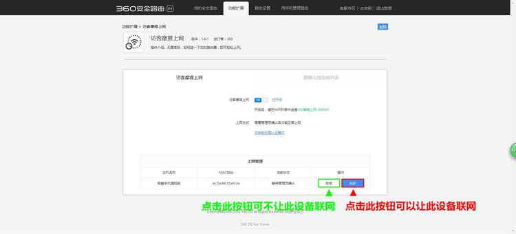 认证完成后,您路由的LAN口指示灯就像跳马一样,从4到1依次闪烁,循环3至5次,即代表摩擦认证成功 如果您要开启管理员认证模式,点击页面上的“切换到管理员认证模式”按钮,就可以了,如下图 在管理员认证模式下,所有通过访客摩擦上网的设备,必须经过您的允许后,才可以正常联网,如下图所示 当有新设备连接到管理员认证模式下的访客摩擦上网时,您需要在设置页面上,点击“上网管理”列表下面的“允许”按钮,对应的设备才可正常联网,如下图所示 360安全路由有四大主要安全防护功能,分别是防蹭网、防盗号、DNS 防劫持、恶意网站拦截等。 |