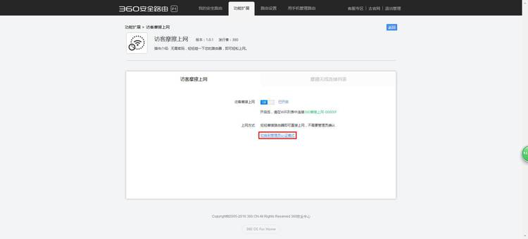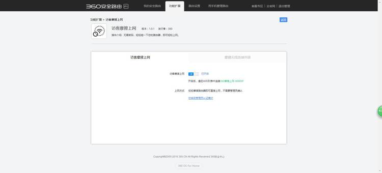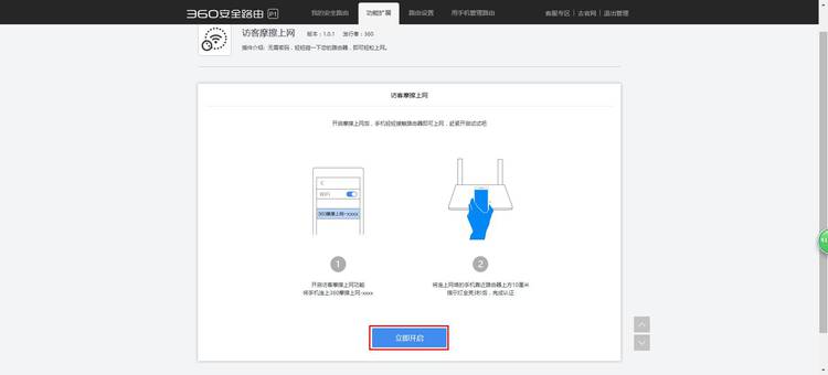360安全路由(C301)是360自主研发的一款具备多重防护功能的智能安全路由器。360安全路由拥有全方位防黑,高速双频1200M、智联智控、精工打造、高性价比等特点。从捍卫网民利益出发,首创360sOS安全系统彻底解决路由器安全问题,真正做到“WiFi—防入侵蹭网无门,路由—防篡改防劫持”,为广大用户的家庭网络安全保驾护航。 首先,在浏览器地址栏中输入您安全路由的管理地址(通用地址:luyou.360.cn 或 默认地址:192.168.0.1),然后,输入管理密码。输入管理密码后,点击“登录”按钮,如下图 打开Web管理页的主界面后,点击顶部的第二个选项“功能扩展”按钮,如下图 进入“功能扩展”界面后,点击快捷工具下的“访客摩擦上网”这个工具,如下图 然后,点击“立即开启”按钮,如下图 点击立即开启后,您的路由将创建一个无密码的WiFi热点(360摩擦上网开头的SSID) 目前,访客摩擦上网功能支持两种认证模式,无需认证模式和管理员认证模式(默认是前者)接下来,小编就来给您介绍一下上述两模式的操作方法 在无需认证模式下,设备首先连接访客摩擦上网的WiFi热点,然后靠近您的路由(距离路由上方10厘米左右),即可完成摩擦认证并正常联网,如下图