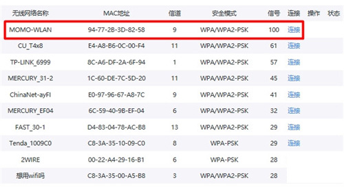 6、在搜索结果中,找到主路由器的无线信号,选择:连接。