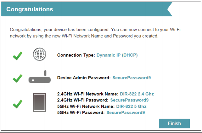 4.设置您的WiFi名称和密码,然后单击“下一步”。 ![]() 注意: 为了保护您的WiFi网络不被黑客入侵,我们建议WiFi密码包含大写字母,小写字母,数字和符号,并且密码长度应超过8位数字。 5.为您的D-Link路由器设置一个管理员密码,然后单击“下一步”。 ![]() 注意: 每次登录D-Link路由器的设置页面时,都必须输入此密码。因此,记录并保留D-Link路由器的管理员密码。 6.在向导结束时,将为您提供设置的最终摘要。单击完成以关闭向导。