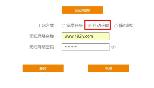 在未使用路由器情况下,电脑连接猫(入户宽带网线)后,自动就可以上网。如果你的宽带与上面描述的一致,那么斐讯K2路由器中的“上网方式”,就应该选择:自动获取——>然后设置“无线名称”、“无线网络密码”——>点击“完成”。