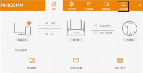 1、首先登陆路由器设置界面,然后点击【高级功能】,如图: