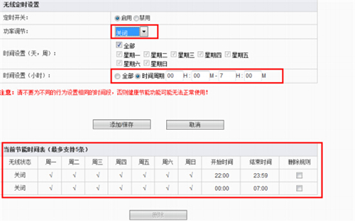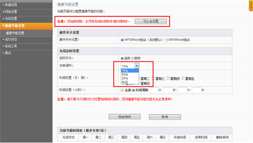 温馨提示:当路由器每次断电重启以后,设备都会恢复到出厂时间,此时健康节能规则应该是不对的: ①您可以点击【与主机同步】,时间就会跟您当前电脑的时间同步。 ②如果您的路由器是工作在【路由模式】下,并且已经能够访问网络,那么下面的【网络时间服务器】会自动的与网络时间同步,但同步过程可能需要几分钟,还请稍等! 4、时间同步以后,开始设置健康节能规则: ①【定时开关】【启用】时建立的规则是有效的,【禁用】时规则无效。 ②【功率调节】:默认路由器没有规则时是工作在 100%的发送功率下的,关闭表示关闭无线。 ③【时间设置(天,周)】:选择规则生效的日期。 ④【时间设置(小时)】:选择规则生效具体时间点。 温馨提示:天、小时里面不能同时选择【全部】,如果需要设置每天的全天 24 小时,可以创建两条规则,比如:一条周一到周五的全部小时;另一条周六到周日的全部小时。