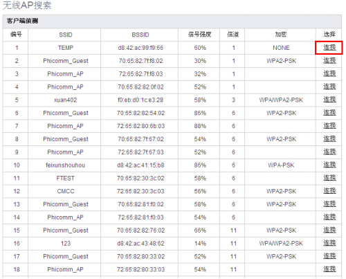 3、点击【无线 AP 列表】,会弹出如下窗口,表格里面显示为附近的无线信号,选择您想连接的无线信号,点击【确定】。