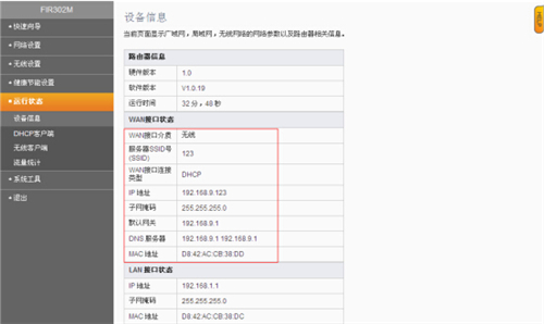 4、点击【确定】以后,【SSID 号】会显示所要连接的无线信号,【安全模式】、【加密类型】一般会自动的变成与上端设备一样,只需要正确填写上端无线信号的【密码】。【WAN 口连接类型】一般选择【动态 IP】即可,有时需根据具体网络环境选择其他连接类型,最后点击【保存】。 5、保存以后点击【运行状态】,若已获取到上端设备分配地址,则表示设置成功,此时已可连接副路由器上网。