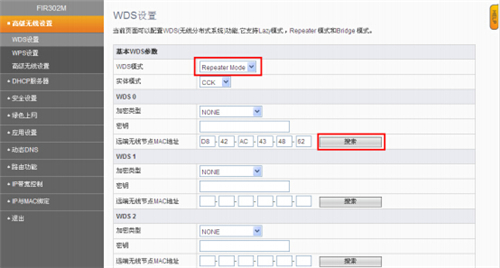 ④WDS 设置。(注意:此时需登陆修改后的 192.168.1.2 进入界面)选择【repeater mode】,点击【搜索】,弹出无线 AP 列表,找到主路由器的信号名称,点击后面【连接】,然后点击下方保存(这里面的密钥不用管)。