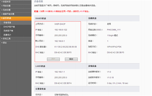 5、 保存以后点击【运行状态】,若已获取到上端设备分配地址,则表示设置成功,此时已可连接副路由器上网。 注意:副路由器中的无线名称、密码与上端路由器是没有关联的,此种无线桥接不建议设置成一样。 二、WDS 无线桥接(此种方式有兼容性要求,最好主、副路由器是同款型号,同时不建议超过两台进行 WDS) 1、建议首先给电脑配置一个地址,方便后面配置,如下图: