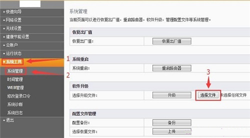 3、在FIR151M的设置界面,点击“系统工具”——>“系统管理”——>在右侧找到“软件升级”——>点击“选择文件”。