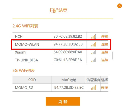 5、在搜索结果列表中,选择需要被桥接的无线信号,如下图所示: