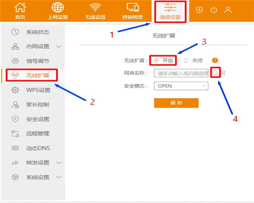4、点击“高级设置”——>“无线扩展”——>在“无线扩展”后面,点击:开启——>然后点击“搜索图标”,如下图所示。