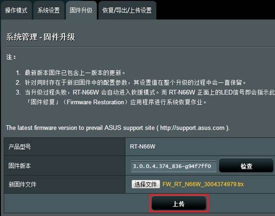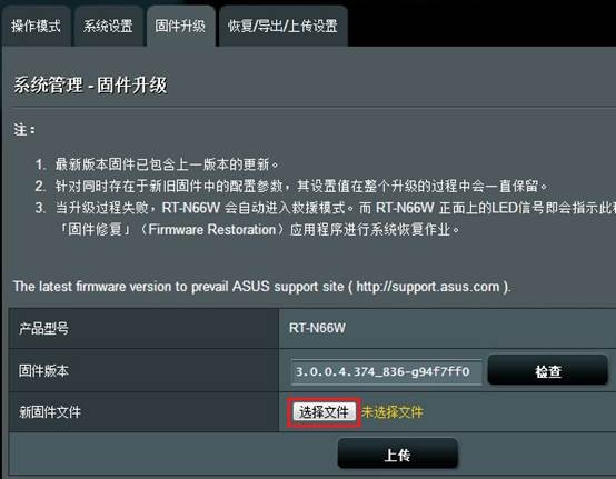 如何更新华硕无线路由器的韧体? (ASUSWRT) 1. 请先依您的型号,在华硕官网下载新版韧体 (这里以RT-N66W举例) ![]() 2. 下载的档案需要解压缩 ![]() 3. 进入华硕无线基地台的设定页面 (预设为192.168.1.1) ![]() 4. 输入登入华硕无线基地台的 [账号密码] >> [登入] (预设帐号密码为小写admin) ![]() 5. 点击设定页面的韧体版本链接 ![]() 6. 点选 [选择档案] ![]() 7. 开启下载的新版韧体档案 >> [开启] ![]() 8. 点选 [上传] ![]() 9. 等待更新完成 ![]() 10. 更新完成 ![]() ※注意:建议更新后按压无线路由器后方 [Reset] 钮5秒再放掉;还原原厂设定后再做设定! ![]() |