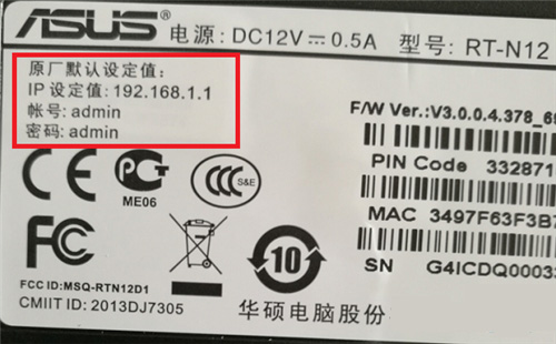 3、不同型号的华硕路由器,登录设置页面的网址也不一样,主要有2种:192.168.1.1和router.asus.com。所以,需要先弄清楚你自己这台华硕路由器的设置网址到底是多少? 可以在自己这台华硕路由器的底部铭牌/标签中,查看到该路由器的设置网址信息,如下图所示: