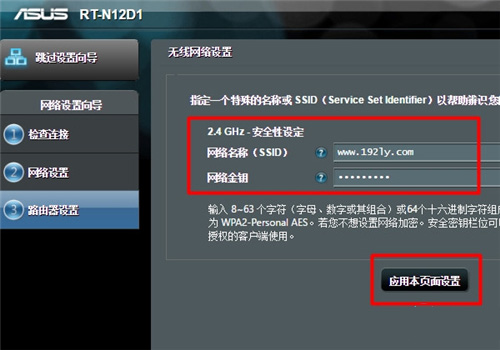 温馨提示: (1)、如果自动侦测到你的网络连接类型输入:动态IP(DHCP),则会直接跳转到设置无线名称、无线密码的页面。 (2)、仅在您第一次设置这台华硕路由器,或者路由器恢复出厂设置后再次设置时,系统才会自动侦测你的宽带连接类型。 (3)、如果系统无法侦测到你的宽带连接类型,请点击“跳到手动设置”选项,手动选择宽带连接类型。 8、设置这台华硕路由器上的无线名称、无线密码,然后点击“应用本页面设置”。