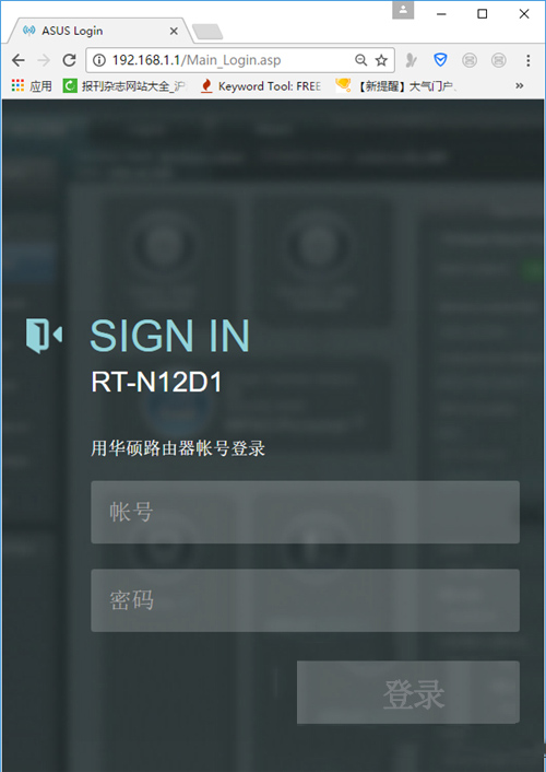 4、在电脑的浏览器中,输入这台华硕路由器的设置网址,本例中是:192.168.1.1——>输入默认的用户名、默认密码:admin,登录到设置页面。