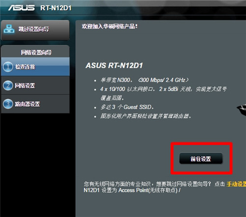 温馨提示: (1)、大家自己在设置的时候,在浏览器中输入的设置网址,请以你自己这台华硕路由器底部铭牌中给出的信息为准。 (2)、如果这台华硕路由器是第一次设置,输入192.168.1.1 或者 router.asus.com后,不会出现输入用户名和密码的页面,会直接进入到一个设置向导界面。 5、运行设置向导,点击“前往设置”。