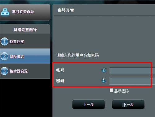 7、此时华硕路由器会自动检测你的网络连接类型,如果见到你的宽带连接类型是:PPPoE类型,会出现下图所示页面。请在“帐号”选择中填写:宽带账号——>在“密码”中天填写:宽带密码——>点击“下一步”。
