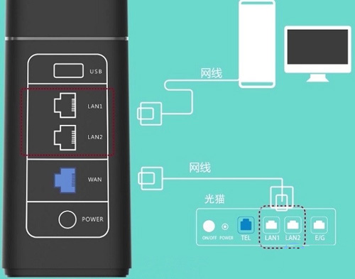 1、华为A1路由器上的WAN接口(蓝色接口),需要用网线连接到宽带猫/光猫的网口。如果你的宽带没有用到猫,则需要把入户的宽带网线,插在华为A1路由器的WAN接口上面。电脑用网线连接到华为A1路由器的LAN1、LAN2接口(灰色接口)中任意一个。