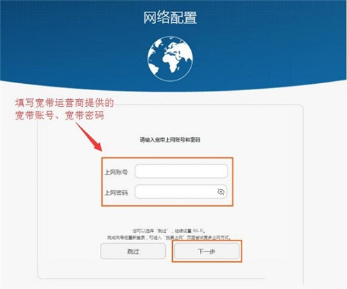 3、此时华为WS832路由器会自动检查上网方式,如果检测到上网方式是 拨号上网,则会提示用户输入:“上网账号”、“上网密码”——>然后点击“下一步”。