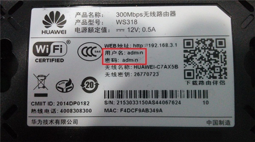 温馨提示:华为WS318路由器默认登录密码是:admin,可以在底部铭牌中查看到,如下图所示。