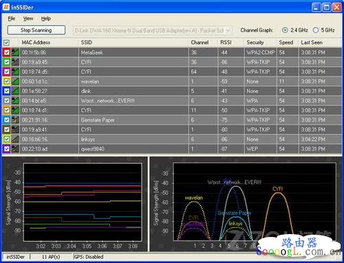 第三,如果以上的方法都没有解决的话那就是信号的问题了,如果你身边有很多信号的话那就容易出现这个问题,如果路由器与路由器之间的频段信道相同或者是相邻,就会导致这种问题。 解决的方法也很简单,更改信道频段就可以了,但是我们怎么知道哪个信道不冲突呢?我们可以使用InSSIDer这款软件来实现,可有轻松把周围的路由器信息监测出来,找到信道这一项就可以了。