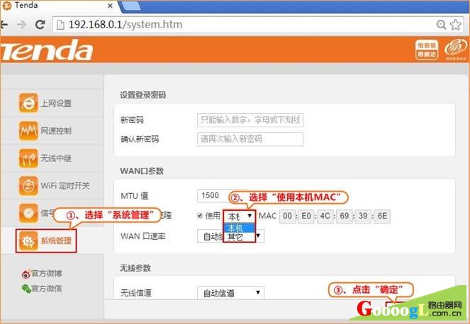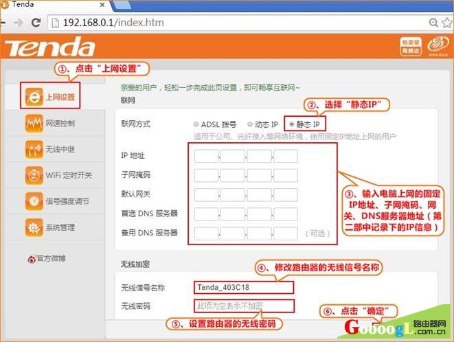 ![]() 2.右键点击“本地连接”,选择“属性”: ![]() 3.双击“Internet 协议(TCP/IP)”: ![]() 4.记录下当前电脑的IP地址,然后选择“自动获得IP地址”“自动获得DNS服务器地址”,点击“确定”再点击“确定”即可: ![]() 1.在浏览器 2. 点击“上网设置”,选择联网方式为“静态IP”,输入电脑上网固定的IP地址,子网掩码,网关,首选DNS服务器,点击“确定”,如下图: ![]() 3.点击“系统管理”,选择 “克隆本机MAC”,点击“确定”: 设置完成后,便可以浏览网页,上网冲浪了。 温馨提示:如果还有其他电脑需要上网,直接将电脑接到路由器LAN1/LAN2/LAN3任意空闲接口,参照第二步将本地连接改成自动获取IP地址即可,不需要再去配置路由器。 常见问题: 1.如果上网的固定IP为192.168.0.X,请将路由器的LAN口地址修改为192.168.8.1 腾达(Tenda)FH456阿里版-如何设置静态IP上网?