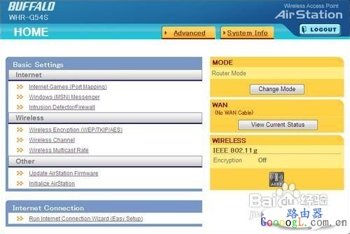 成功登录Buffalo操作面板后,在页面的左边最大一块是常见的基本设置。其中包括了Internet互联网,无线网络,以及其他信息。 Internet互联网栏目下有网络游戏(端口映射),Windows Messenger (MSN),入侵探测器/防火墙三个链接选项,点击之后便能进入相关的设置界面。接下来的是无线网络栏目,其中包括了无线加密设置(WEP/TKIP/AES),无线信道以及无线多点传输率选项。而其他栏目则有升级固件和初始化路由器功能。 右边黄色的三个板块由上而下分别是:路由模式,WAN广域网,以及无线网络状态信息。首先,我们单击“更改模式”按钮更变路由器的模式;接下来我们会发现WAN栏目上显示了未接入网线字样,这是在截图时我的路由器还没有接上网线的缘故,点击下面的“查看目前状态”按钮还可以了解更详细的信息。无线网络状态显示了当前的网络协议标准以及是否已经开启加密。