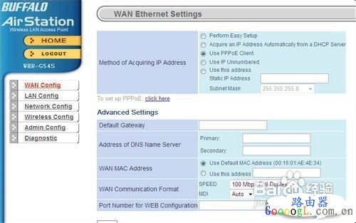接上路由器后的第一反应当然是希望能上网!先点击进入WAN设置页面。在此界面下,用户首先要做的是选择获取IP地址的方式。由上至下分别是:通过运行简易设置获得,通过DHCP服务器自动获得,使用PPPOE客户端,借用IP地址,用户指定地址。如果希望通过DHCP服务器自动获得IP地址的话,需要注意DHCP服务器功能是否已经开启。一般用户如果通过PPPOE方式获得IP的话可以选择使用PPPOE客户端选项,若是用户希望自定义IP地址的话则选择最后一项,并在下面输入框内输入响应的IP以及子掩码。板块下面提供了一个PPPOE设置的链接,下文我们会进行专门探讨。 页面的下半部分是高级设置。排在第一位的是默认网关,用户可根据自己实际网关地址在右边输入框输入。接下来是设置主要和次要DNS服务器地址,通过输入的服务器解析域名,操作与在Windows下差不多。DNS服务器下面的是WAN MAC地址设置。该设置有两个选项,第一个是默认使用网卡的Mac地址,第二个选项则允许用户自行指定一个Mac地址。倒数第二项是WAN通信格式。这里提供了通信速度设置以及介质相关接口,默认是自动。最后为进入操作面板指定特定端口,如无特殊需要,我们还是将其留空。