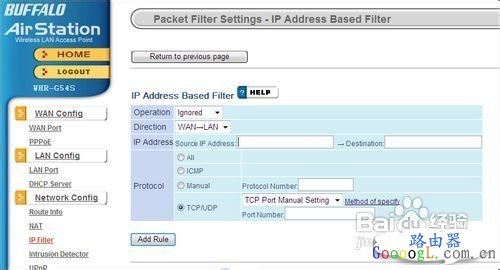 进入IP过滤规则页面后,我们可以根据自己需要进行过滤。在操作菜单选项下,用户可以选择对指定IP的操作方案,这里我们选择了“忽略”。操作下面的为通信方向:从WAN到LAN或者从LAN到WAN。接下来我们在IP地址框输入源地址以及目标地址。最后我们为输入的IP地址指定协议以及输入端口号就可以完成IP过滤设置了。