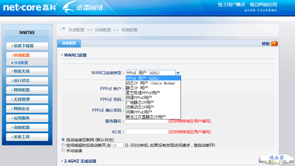 进入路由器主页以后,点击左边导航栏的第二项“快速配置”。