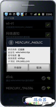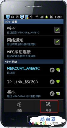 STEP1:打开Wi-Fi设置”页面,找到并点击原有保存的无线配置文件(本例为“MERCURY_A4E62C”),弹出不保存(删除)配置文件选项。 STEP2:选择“不保存”。删除配置文件之后,重新搜素无线信号进行连接。 2. 如果手机无线显示“已连接”但是不能上网,有一种可能是手机的IP地址等参数配置错误。下面介绍手机IP地址的配置方法。推荐使用默认的自动获取IP地址。 STEP1:手机无线连接上无线路由器之后,按键“MENU”菜单键,弹出“高级”按钮。点击“高级’,弹出手机IP地址配置页面。