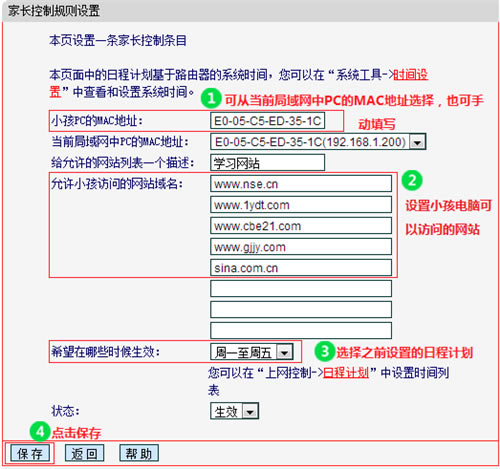 添加周一至周五允许上网的时间(即20:00-22:00)后,点击 保存。