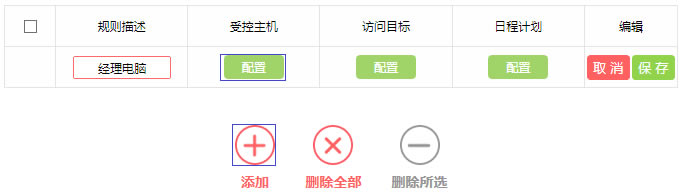 步骤二:设置经理电脑上网规则 1、添加新规则 在设置界面点击 添加,添加经理电脑的访问权限。点击受控主机栏的 配置,如下图: