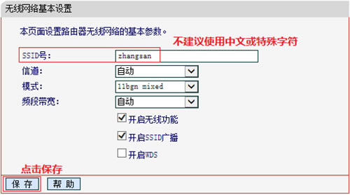 路由器没有默认管理员密码,密码是初次设置路由器时设置好的,如忘记密码,必须复位路由器。 3、登录管理界面后,点击 无线设置 >> 基本设置,修改SSID号(即无线网络名称),其他设置保持默认,点击 保存。如下: