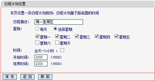 2、添加周一至周五允许上网的时间(即20:00-22:00)后,点击 保存。