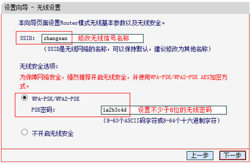 8、修改SSID (即无线网络名称),在 PSK密码 的位置设置无线密码,点击 下一步。