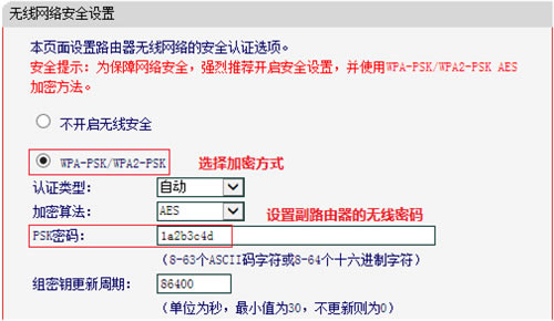 6、设置副路由器无线密码,点击 无线设置 >> 无线安全设置,选中 WPA-PSK/WPA2-PSK AES,PSK密码 处填写和主路由器相同的无线密码,点击页面下方的 保存。