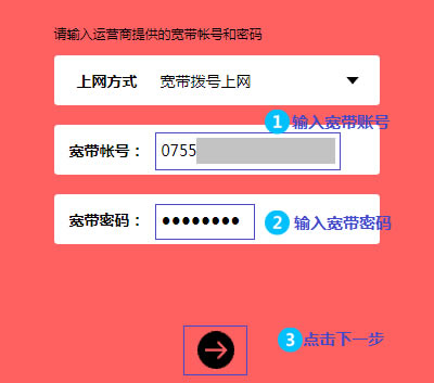 4、路由器会自动检测上网方式,如检测为 宽带拨号上网,在对应设置框中输入运营商提供的宽带账号和密码,并确定该账号密码输入正确,点击 下一步。