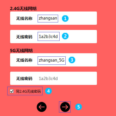 温馨提示:76%的用户因为输错宽带账号密码导致无法上网,请仔细检查输入的宽带账号密码是否正确,注意区分中英文输入、字母大小写、后缀是否完整等。如果不确认,请咨询宽带运营商。如果上网方式检测为自动获得IP地址或固定IP地址上网,请根据向导提示操作,填写对应参数即可。 5、分别设置2.4G和5G网络的 无线名称 和 无线密码,无线名称 建议使用数字、字母组合,请勿使用中文或特殊字符,并设置8位及以上的无线密码。建议2.4G和5G无线网络的无线名称不要设置为完全相同;如果勾选 同2.4G无线密码,则2.4G与5G的无线密码相同。点击 下一步。
