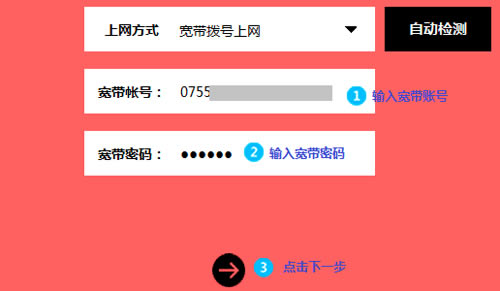 3、路由器会自动检测上网方式,如检测为 宽带拨号上网,在对应设置框中输入运营商提供的宽带账号和密码,并确定该账号密码输入正确,点击 下一步。