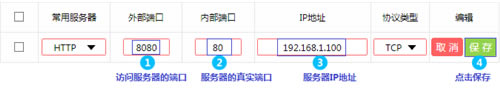 温馨提示:外部端口可以根据实际需要修改,内部端口必须与服务器端口一致。 至此,虚拟服务器规则设置完成。 4、根据以上设置,Internet中的客户端通过浏览器访问网页服务器,访问形式如下: