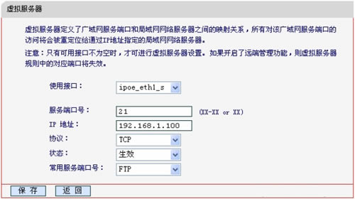 4、映射21端口:“服务端口号”后面填写“21”——>“IP地址”后填写192.168.1.100——>“协议”后面选择TCP——>“状态”选择“生效”——>点击“保存”。
