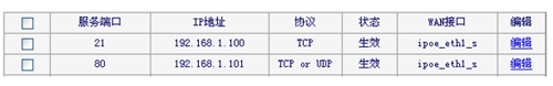 5、映射80端口:再次点击“添加新条目”,然后在“服务端口号”填写“80”——>“IP地址”后填写“192.168.1.101”——>“协议”选择“ALL”——>“保存”。 6、在虚拟服务器列表下可以看到刚才设置的2条映射规则,如下图所示: