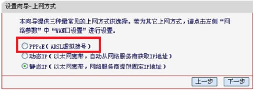 ①PPPoE(ADSL虚拟拨号),开通宽带的时候,运营商提供了宽带账号、宽带密码。在未使用路由器时,猫(宽带网线)直接连接电脑上网时,电脑上需要用“宽带连接”(类似的程序),填写宽带账号、宽带密码,进行拨号,拨号成功后,电脑才能上网。如果你的宽带符合上面介绍的情况,“上网方式”就应该选择:PPPoE(ADSL虚拟拨号)——>“上网账号”填写:宽带账号;“上网口令”填写:宽带密码——>点击“下一步”。