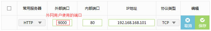 [2]添加网页服务器: 对外开放端口为9000,内部端口为服务器真实端口80,点击 保存,如下图: