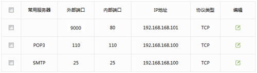 注意:外网用户访问服务器的时候使用外部端口,该端口可以与内部端口一致。 [3]添加邮件服务器: 邮件服务器使用SMTP(25)、POP3(110),需要添加两条规则,如下图: