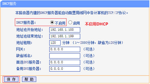 注意:设置无线密码后暂不重启,继续设置。 步骤三:关不CHCP服务器 在管理界面左侧 DHCP服务器 >> DHCP服务 中,将DHCP服务器选择为 不启用,点击 保存。