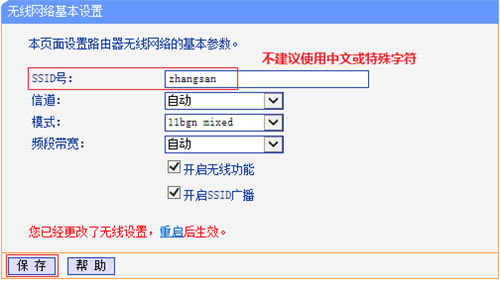 注意:为了避免IP地址或DHCP服务器冲突,此处暂不将TL-H39RD连接到前端网络。 步骤二:修改无线参数 1、修改SSID(无线名称) 登录路由器管理界面,进入 无线设置 >> 基本设置,在SSID中设置无线名称,点击 保存。